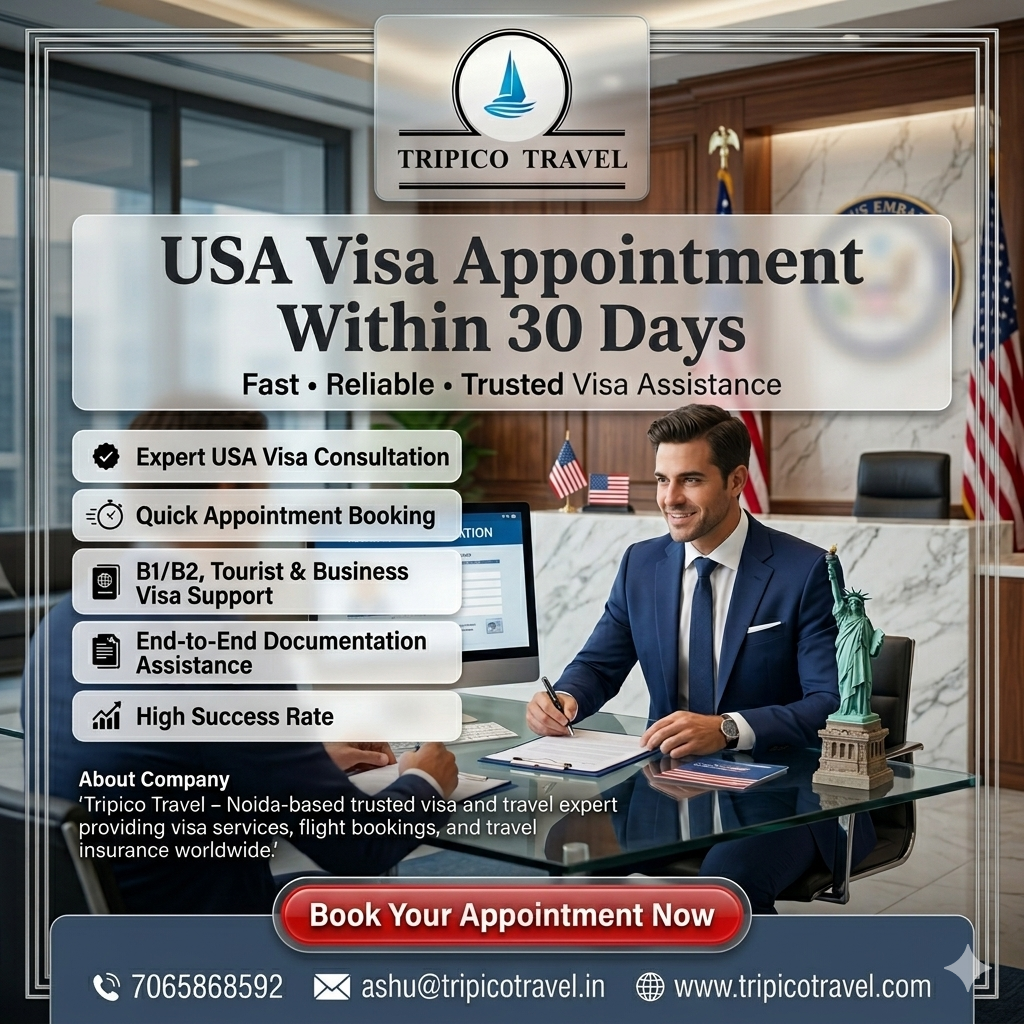 Get fast USA visa appointment within 30 days with Tripico Travel, the best visa agent in Noida. Expert assistance for B1andB2, tourist & business visas with complete documentation support. High success rate. Contact now.