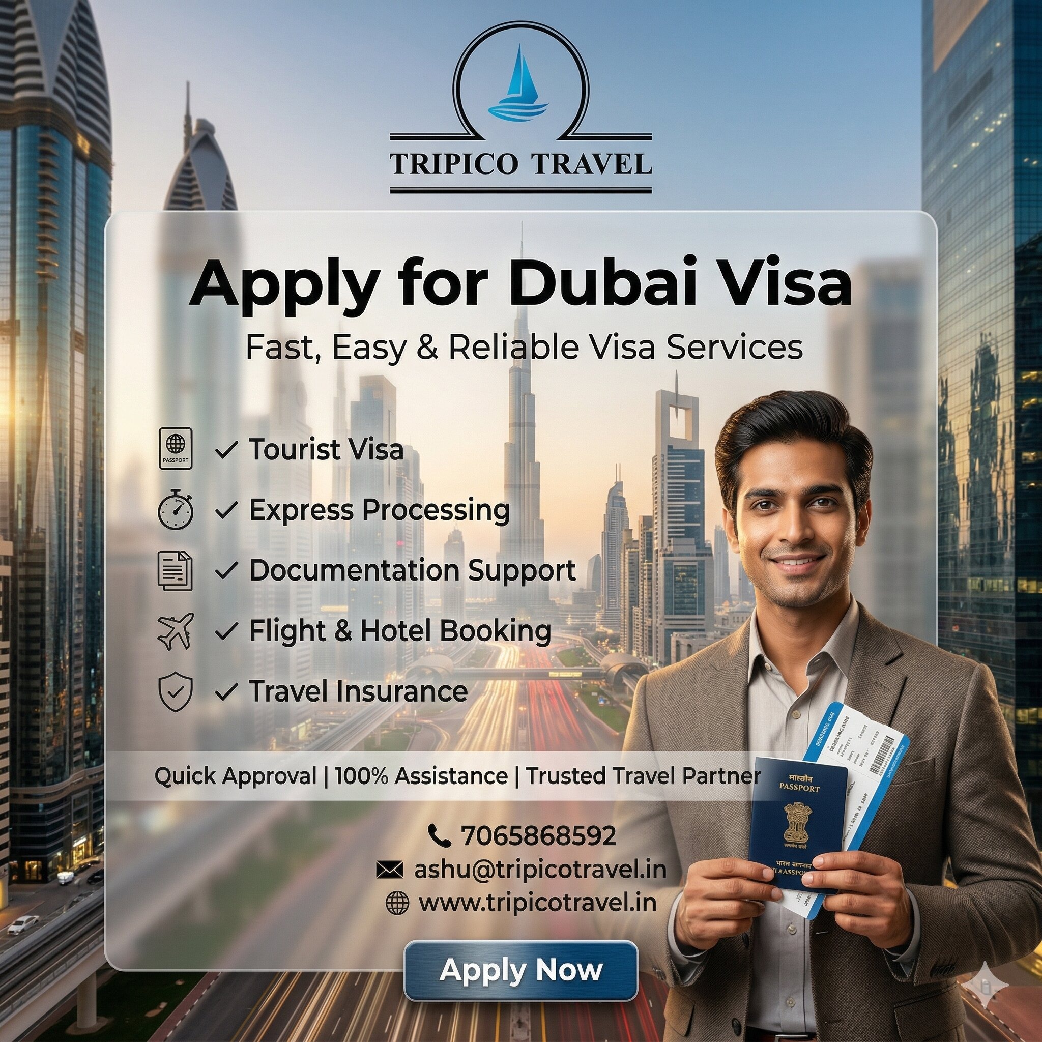 Apply for your Dubai Visa with Tripico Travel and experience fast, reliable, and hassle free visa processing. We specialize in providing quick Dubai tourist visas with complete documentation support, ensuring a smooth and stress free experience for every traveler. Whether you are planning a holiday, business trip, or family visit to Dubai, our expert team handles everything from application to approval. At Tripico Travel, we offer express Dubai visa services, travel insurance, flight bookings, and hotel reservations all in one place. With a high success rate and dedicated customer support, we make your international travel simple and convenient.