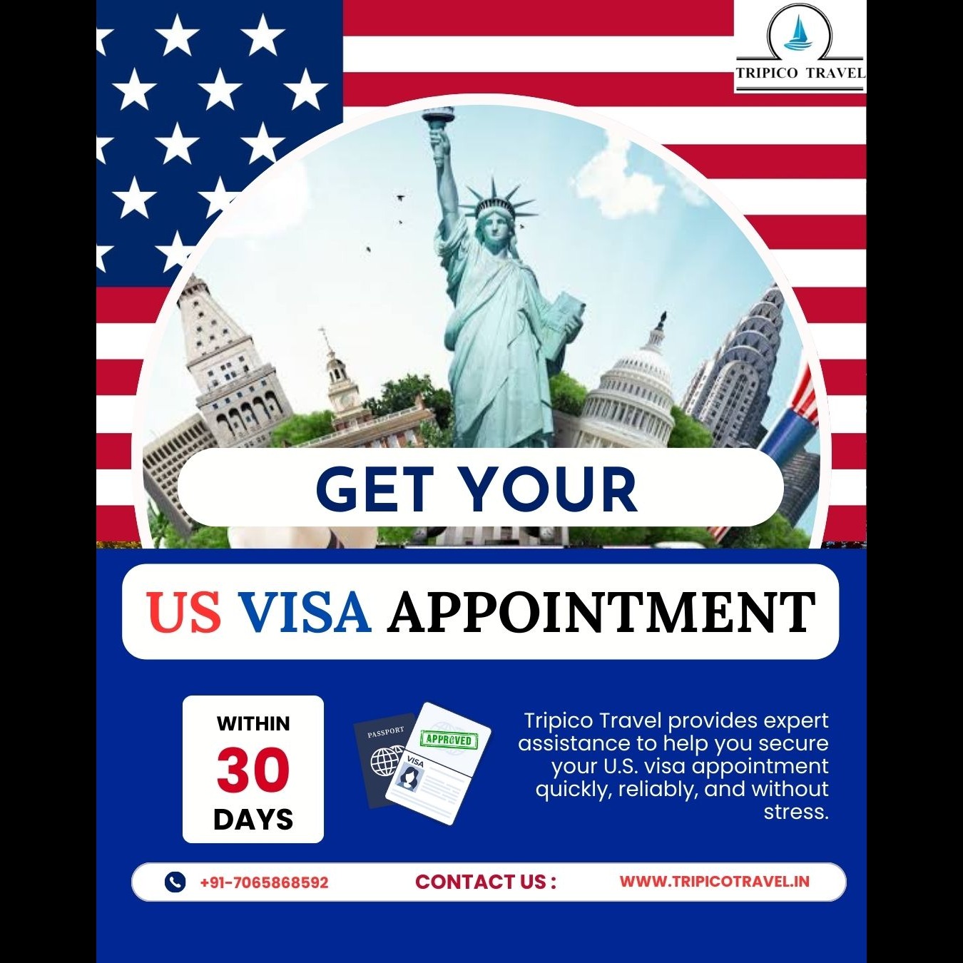 Tripico Travel offers expert support to help clients secure their US visa appointments efficiently and without hassle. By leveraging their professional guidance, individuals can expect an appointment within 30 days, making travel planning smoother and more predictable. The service focuses on speed, reliability, and eliminating common difficulties associated with the visa process.