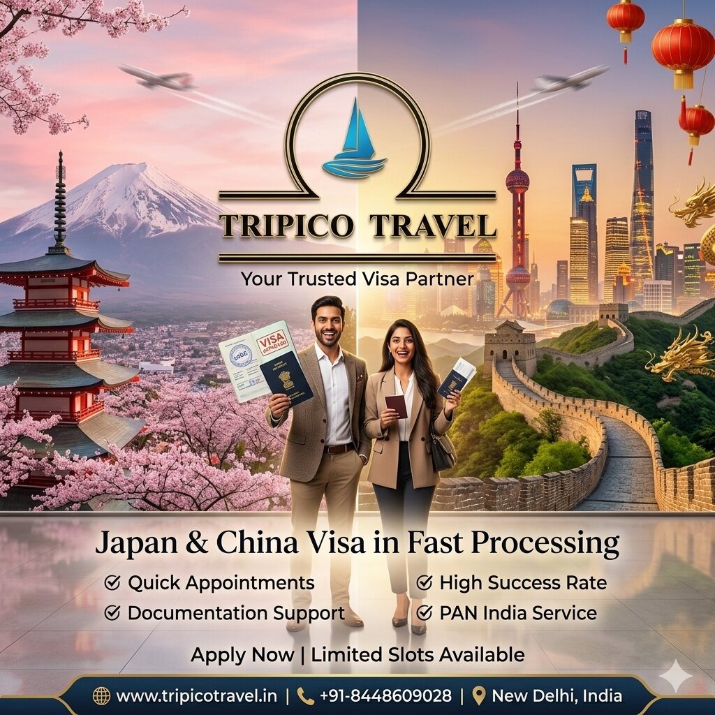 Tripico Travel offers reliable and fast Japan and China visa services for Indian travelers. Our expert team provides complete documentation assistance, quick appointment booking, and end-to-end visa support to ensure a smooth process. Whether you are applying for a tourist or business visa, we simplify every step with high approval success rates. Based in Delhi, we serve clients across India with professional and transparent services. Choose Tripico Travel for hassle free Japan and China visa processing.