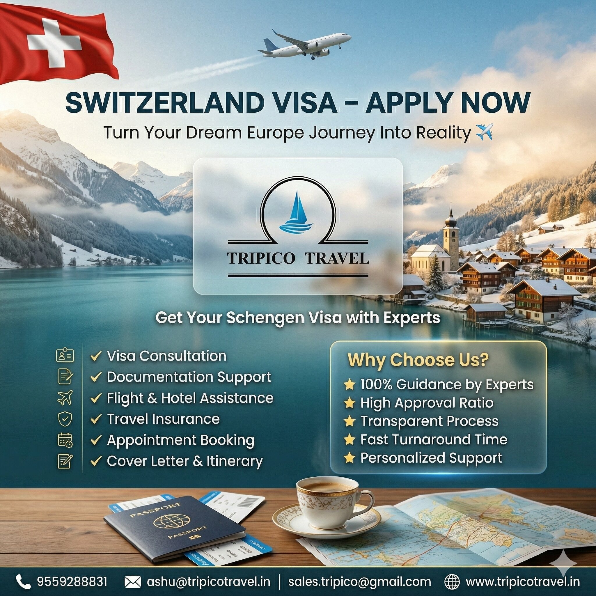 Planning to visit Switzerland. Tripico Travel offers professional and reliable assistance for applying for a Switzerland Schengen visa from India. Whether you are traveling for tourism, business, or family visits, our experts ensure a smooth and stress free visa process.We provide complete support including visa consultation, document preparation, travel itinerary, hotel bookings, travel insurance, and appointment scheduling at VFS Global centers. Our experienced team helps improve your chances of visa approval by guiding you at every step. With fast processing and personalized service, Tripico Travel is your trusted partner for Swiss visa applications. Avoid delays and rejections by choosing our expert visa services.