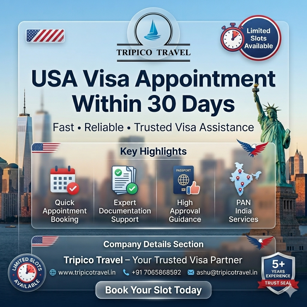Looking for a fast and reliable way to book your USA visa appointment. Tripico Travel offers professional visa assistance to help you secure your US visa appointment within 30 days. With years of experience in visa processing, we provide complete support including appointment booking, documentation guidance, and interview preparation.